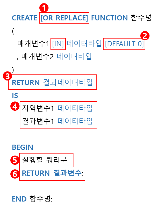 ④ 지역변수는 BEGIN 내의 실행할 쿼리문에서 사용될 변수. 결과변수는 함수 호출한 결과를 저장할 결과변수.