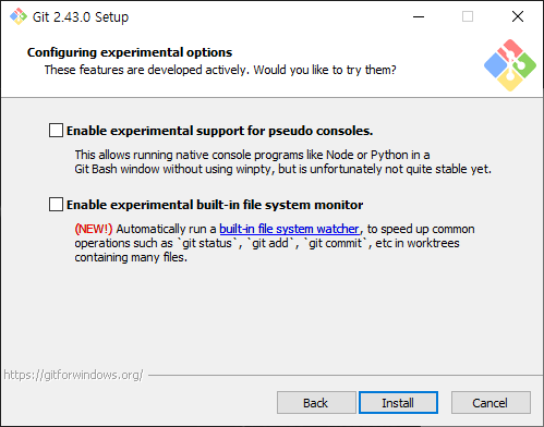 ▲ 실험적옵션 선택(미선택) --> install 클릭시 설치 시작됨