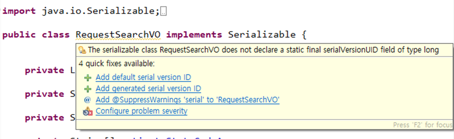 Serializable 인터페이스를 상속하고, serialID가 없으면 클래스명에 노란색 줄이 그어진다.