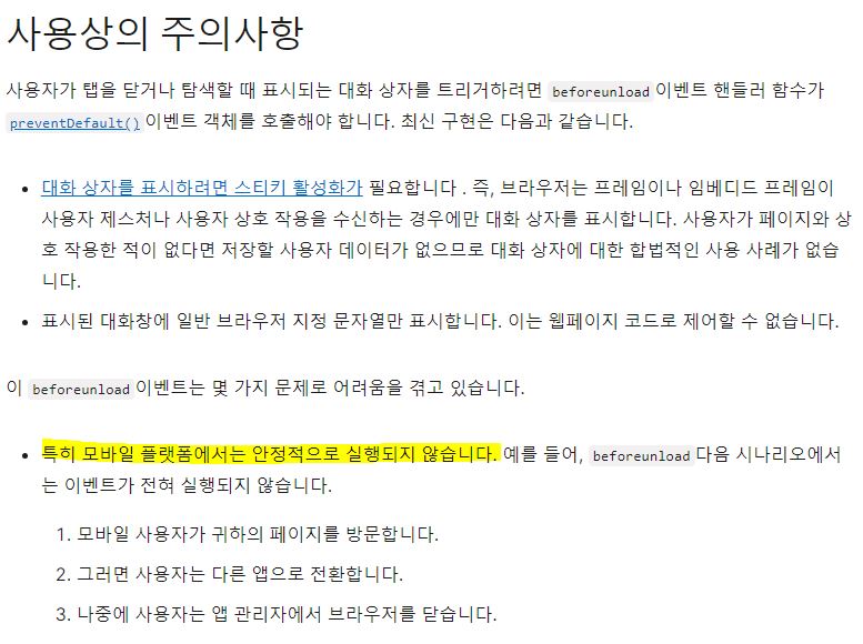 이리저리 찾아보니 MDN에서 beforeunload 이벤트는 모바일에서 특히 불안정하다는 설명내용 발견