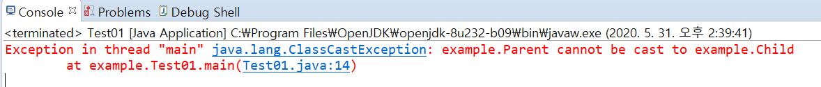 이 코드처럼 Parent 형 참조변수 pt1이 자식 클래스를 참조하고 있다면 명시적 형변환이 포함되어 형변환이 가능하지만, Parent 형 참조변수 pt2가 부모클래스인 자신을 참조하고 있다면 자식클래스로 형변환이 불가능하다.
