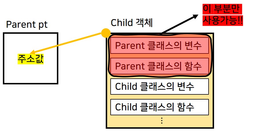 그러나 다형성으로 자식 객체를 생성하게 되었더라도 참조하는 인스턴스의 모든 멤버를 사용할 수 있는 게 아니다. 위의 코드를 가지고 설명을 하자면, pt는 Parent 타입으로 Child 객체를 참조하겠다고 선언하고 있지만 Parent 타입이기 때문에 Child 객체 중에서도 Parent의 멤버만 사용할 수 있다는 것이다. 아래 그림을 참조한다.