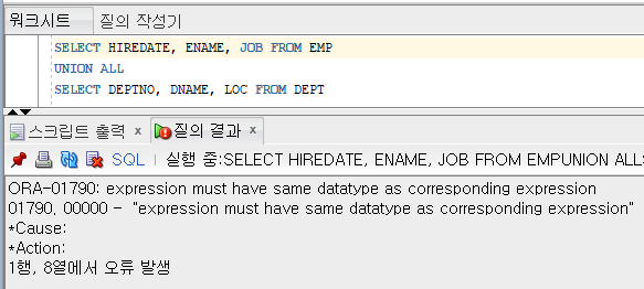 그렇지 않으면 아래의 예시처럼 HIREDATE(Date 타입) - DEPTNO(Number 타입) 간에 데이터타입이 동일하지 않다는 오류가 나는 것을 볼 수 있다.