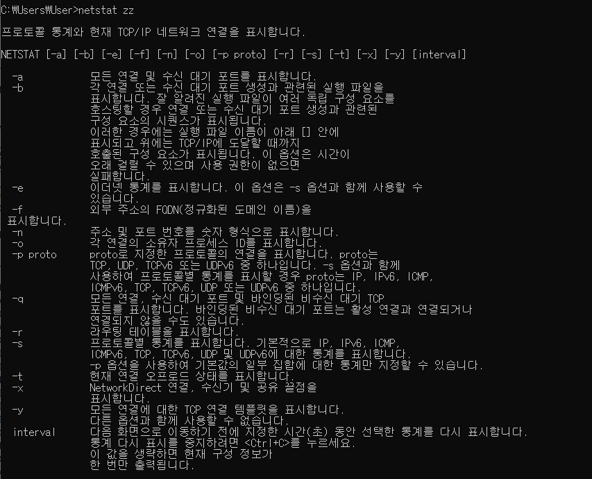 * 옵션에 대한 정보는 netstat + 아무 텍스트나 치면 나오긴 한다.