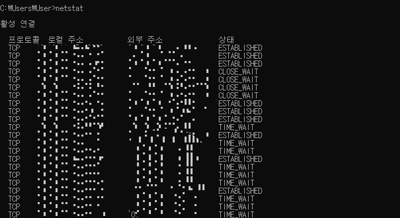 2. 명령 프롬프트에서 netstat 명령어를 통해 네트워크 접속 상태를 확인