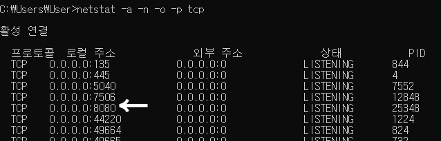 그럼 이렇게 나오는데 여기서 8080 포트가 달려있는 데이터의 PID(process ID) 확인하기