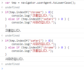 만약, 크롬 브라우저인지를 검사하고 싶다면 분기문을 사파리보다 먼저 작성해놔야 될 것 같다.