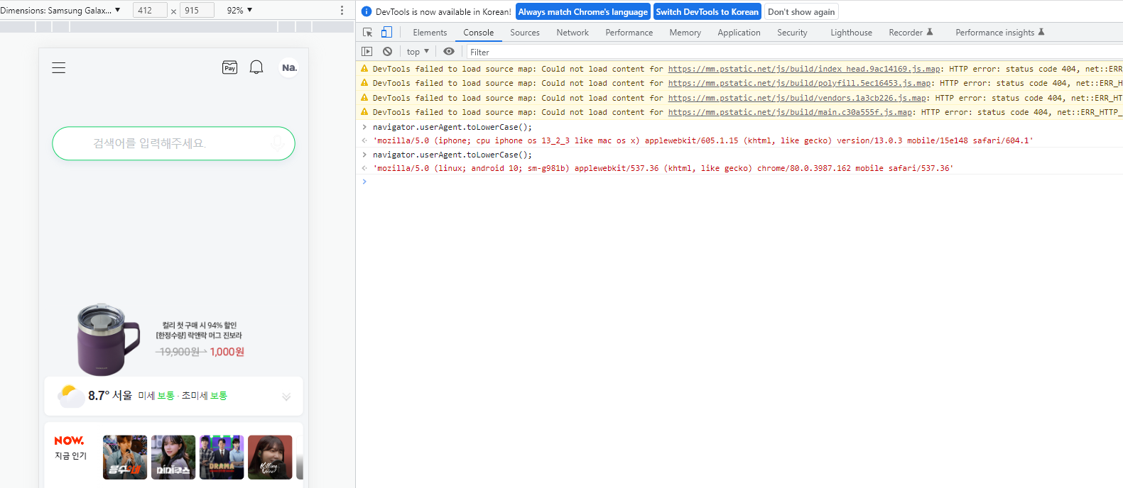 브라우저 콘솔에 치면 나온다. 모바일 웹 테스트 시 기기를 변경하면 userAgent의 내용도 변경된다.