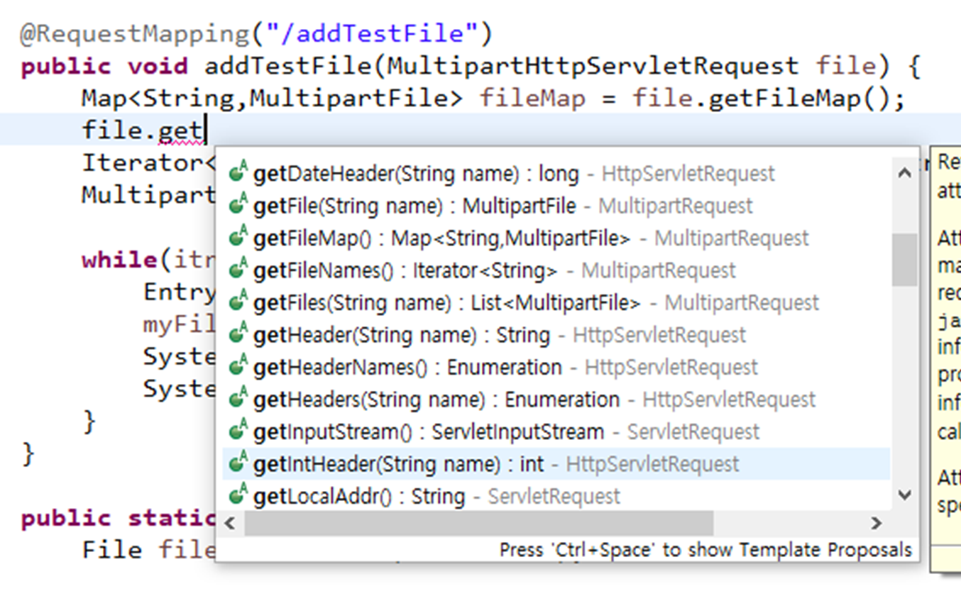 일반 requset 객체처럼 request URL도 얻어올 수 있고, getFile() 또는 getFileMap() 으로 파일 객체를 Map 형태로 얻어올 수 있는데, 한 개의 파일보다는 파일 여러개를 받을 때 유용할 것 같다.