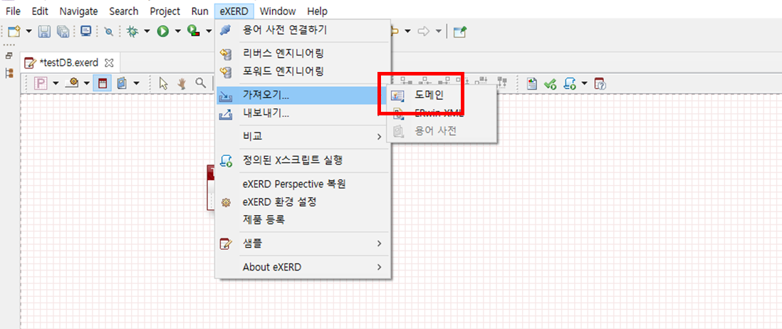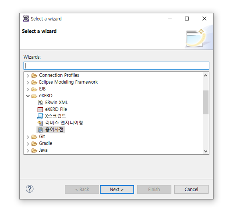 프로젝트 우클릭 > new > other 을 눌러서 eXERD를 검색하면 용어사전 항목이 나옴.
