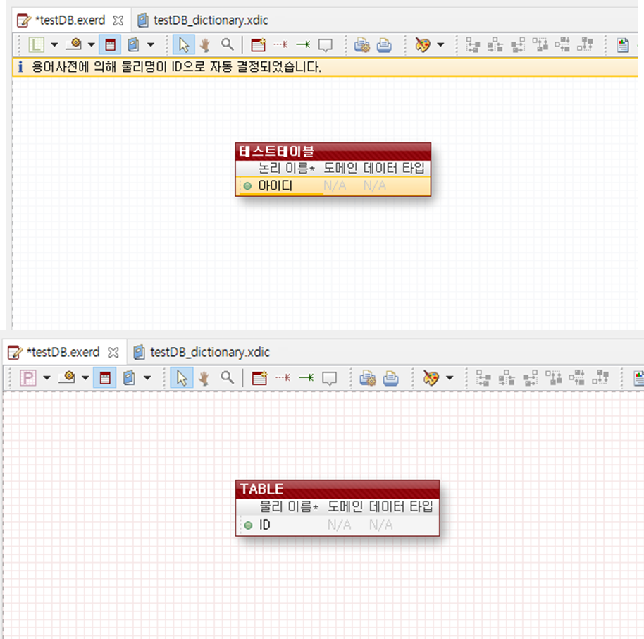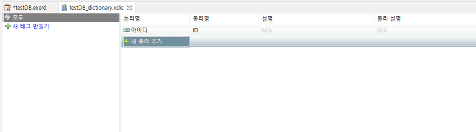 용어사전을 연결하고 나서, 테이블을 만들어서 논리명으로 컬럼명을 작성해본다. 나는 아이디를 추가해놨으니 아이디를 컬럼명으로 작성했다.